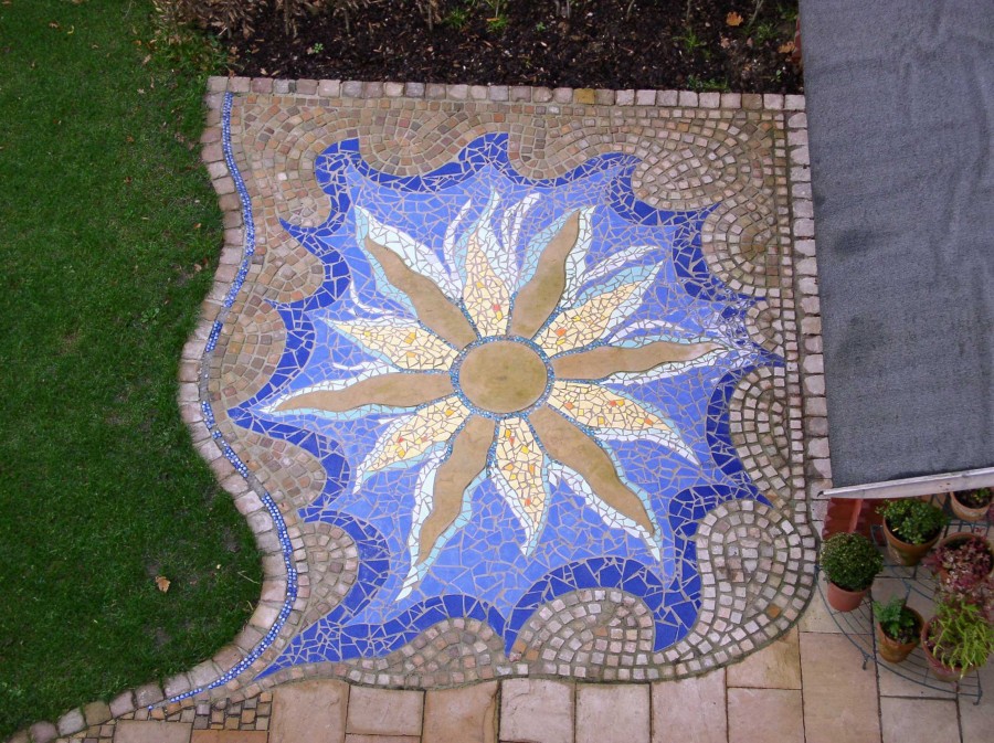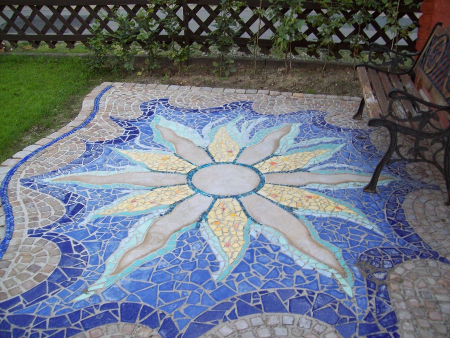 Teils Naturstein und geschliffene Bruchkeramik auf Frostsicherem Untergrund